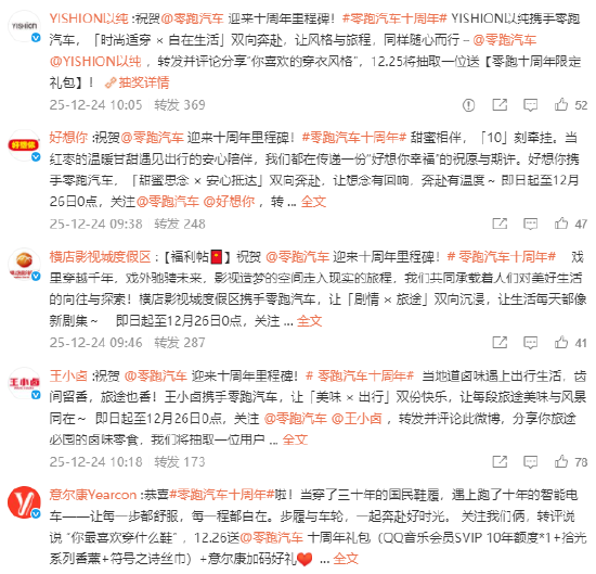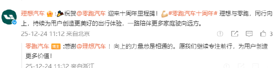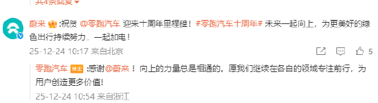 此后,比亚迪汽车、理想汽车、蔚来等今日纷纷发文祝贺零跑汽车迎来十周年里程碑。
